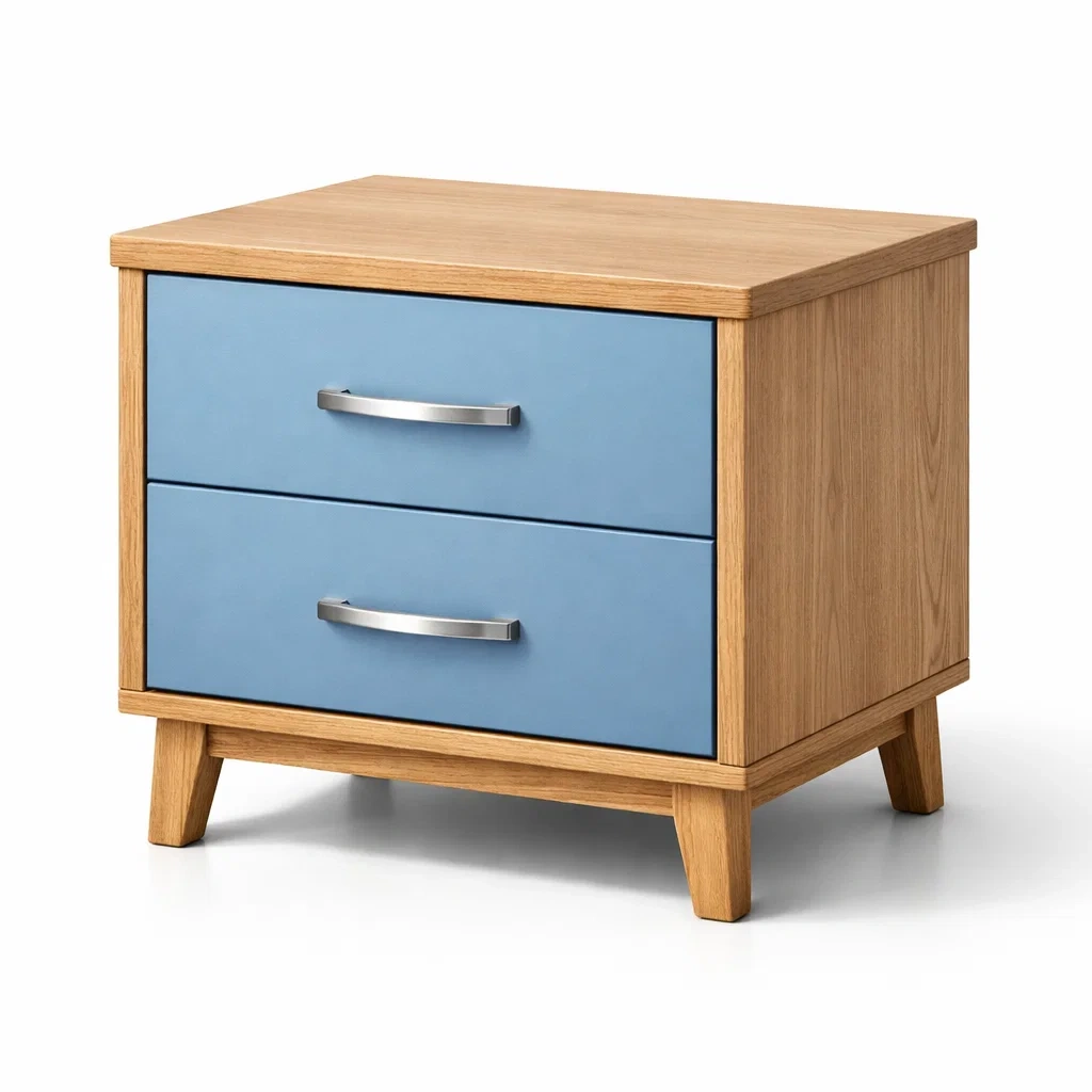 Nachttisch aus eichenholz mit blauen mdf schubladen